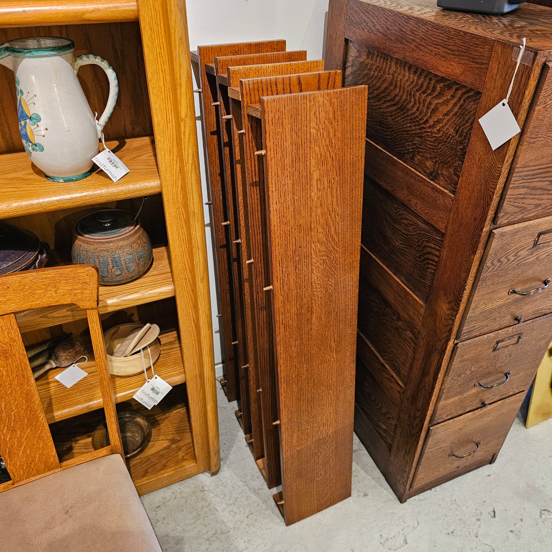 Antique Oak Dining Table. Includes five individual leaves, allowing table to go from a circular 48" diameter to 93" long. Chairs sold separately.